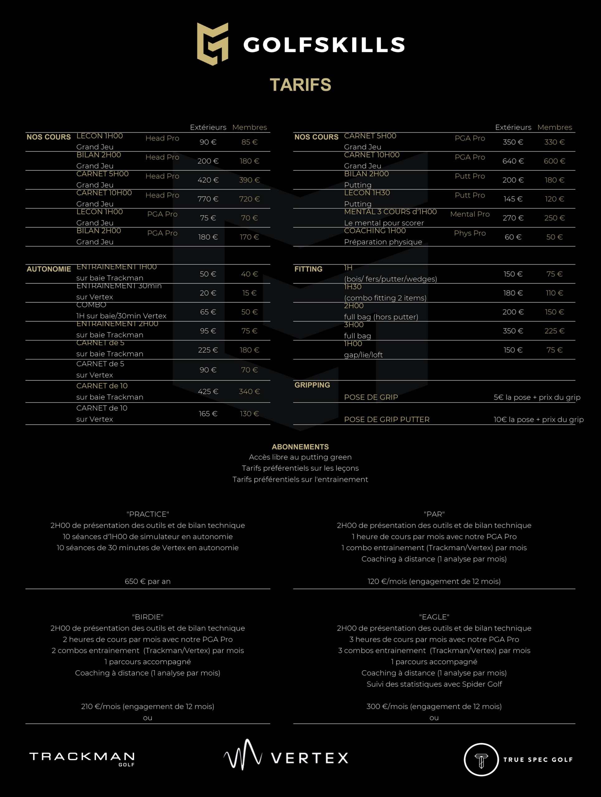 Jean-Pierre Cixous est à votre disposition pour travailler votre putting et votre petit jeu sur notre green de 120m² ou dans son studio équipé de Sam PuttLab et de Quintic Ball Roll. Guillaume Viant-Benard vous fera travailler votre grand jeu ou vous proposera un bilan complet avec Trackman, les plaques Swing Catalyst ou encore les capteurs 3D mySwing.